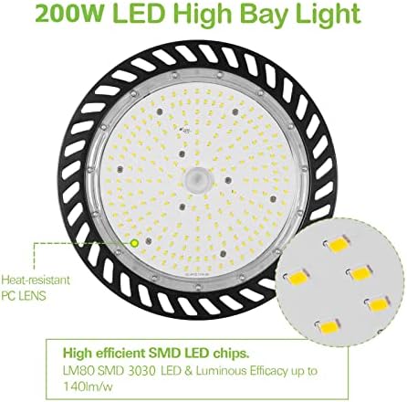 200W UFO LED Excessive Bay Mild Fixture, 28000lm 1-10V Dimmable 5000K 5′ Cable with US Plug, [400W/750W MH/HPS Equiv.] 100-277V, Industrial Warehouse Space Mild for Moist Location