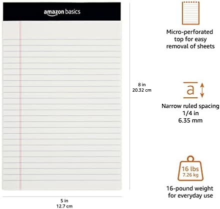 Amazon Fundamentals Slender Dominated 5 x 8-Inch Lined Writing Observe Pads – 12-Pack (50-sheet Pads), White