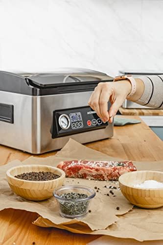 HEAVY-DUTY STAINLESS CONSTRUCTION CHAMBER VAC MACHINE – Working Chamber Sealer dimensions: 11.5″W x 12″L x 3.5″H. Sized for bigger sized meals gadgets and liquids. Features a FREE Vacuum Filler Plate to extend vacuum stress and reduce vacuuming time!