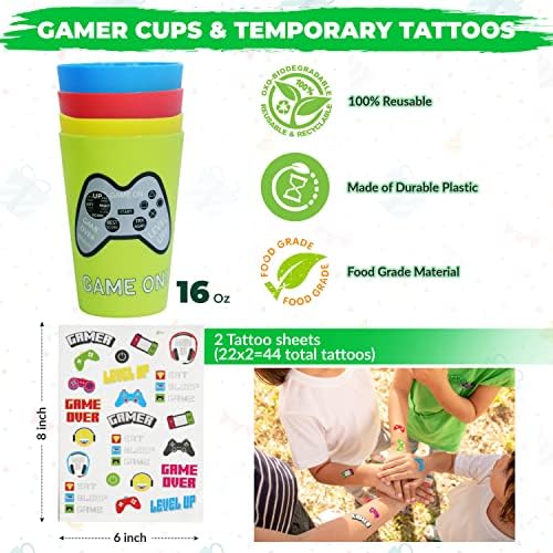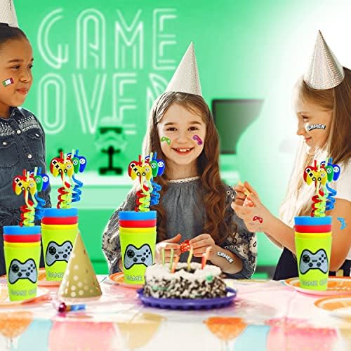 Empire Occasion Provide 76 Pcs Video Sport Occasion Favors – 16 Set of Reusable Gamer Consuming Straws with Gaming Occasion Cups and 44 PCs Tattoos for Children Gamer Birthday Occasion Provides