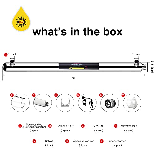 Equip with Chrome steel 304 chamber with 1.0 inch MNPT inlet / outlet, 1x digital ballast with audible and visible alarm,3 x UV filter ,3 x quartz sleeve,3 x mounted clamp