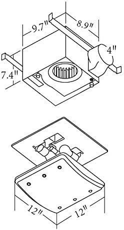 100 CFM, Sones: 25;Housing: 8.9 x 9.7 x 7.4(Inches); Mild cowl: 12x 12(Inches); Duct diameter: 4 inches.