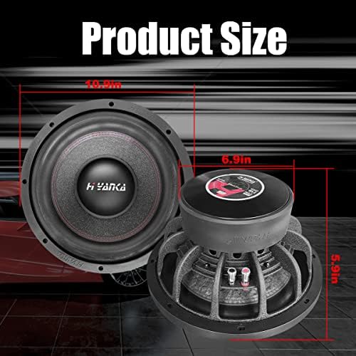 3. 【Product Specs】HYANKA BSF-10-2 10“ Twin 2 Ohm Automotive Subwoofer. Superior to over 90 % of the subwoofer configurations. Peak Energy: 1200 Watts; RMS Energy: 600 Watts; Magnet: Y35 Grade Twin (two items) 170*40; Frequency Response: 45-1000HZ; Sensitivity: 87 dB.