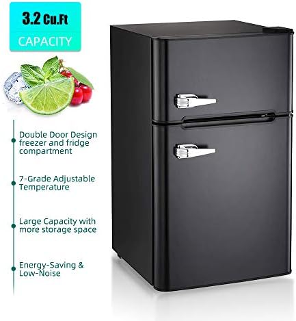 Kismile Double Door 3.2 Cu.ft Compact Fridge with Prime Door Freezer,Freestanding mini Fridge with Adjustable Temperature,Upright Freezer for House,Dwelling,Workplace,Dorm or RV (Black)
