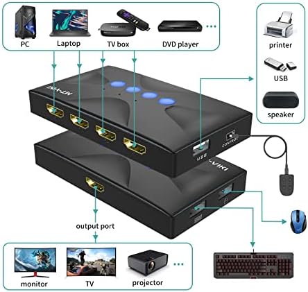 HDMI KVM swap 4 ports lets you handle 4 computer systems by just one set of monitor + USB/wi-fi keyboard & mouse, and share 1 printer, U disk, USB speaker (solely single USB cable) or different usb 2.0 gadgets.