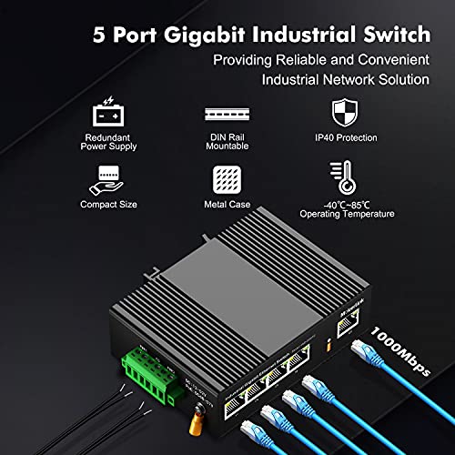 MokerLink 5 Port Gigabit Industrial DIN-Rail Ethernet Change, 14Gbps Switching Capability, IP40 Rated Community Change (-40 to 185°F), with UL Energy Provide