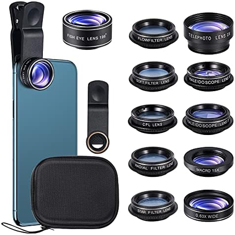 New fgzefort 11 in 1 Cell Cellphone Lens Package Large Angle Lens & Macro Lens+Fisheye Lens+Telephoto Lens+CPL/Move/Radial/Star/Mushy Filter+Kaleidoscope Lens Appropriate for iPhone and Most of Smartphone