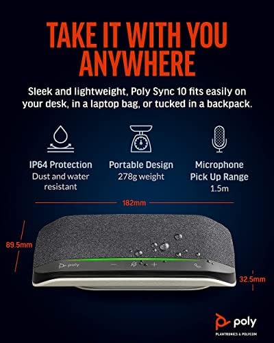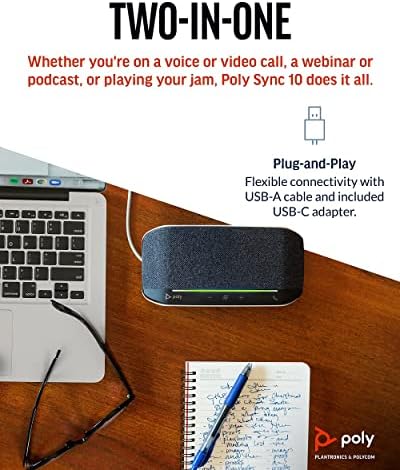 Poly Sync 10 USB Speakerphone (Plantronics) – Two-in-One Transportable Speaker for Audio/Video Convention Calls & Music – USB Powered – Twin-Mic, Full-Duplex Audio – Works with Groups, Zoom, Google & Extra