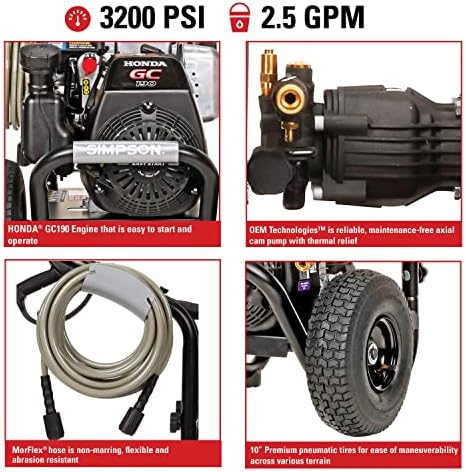 SIMPSON Cleansing MSH3125 MegaShot 3200 PSI Gasoline Stress Washer, 2.5 GPM, Honda GC190 Engine, Contains Spray Gun and Extension Wand, 5 QC Nozzle Ideas, 1/4-in. x 25-ft. MorFlex Hose, (49-State), Black