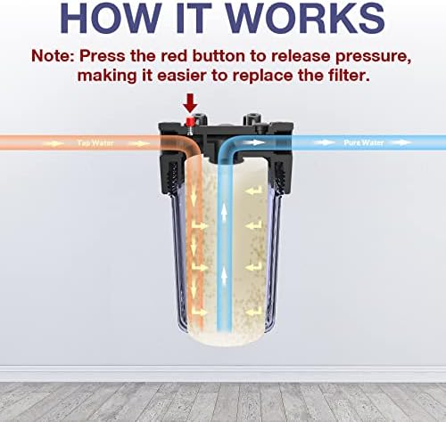 EASY INSTALLATION – The massive filter housing blue comes with all instruments required for set up, together with a wrench, heavy-duty metal mounting bracket, 4 screws. Commonplace 1″ NPT Inlet/Outlet matches most ports. The built-in pink pressure-relief button for water strain launch, making it simpler for filter substitute.