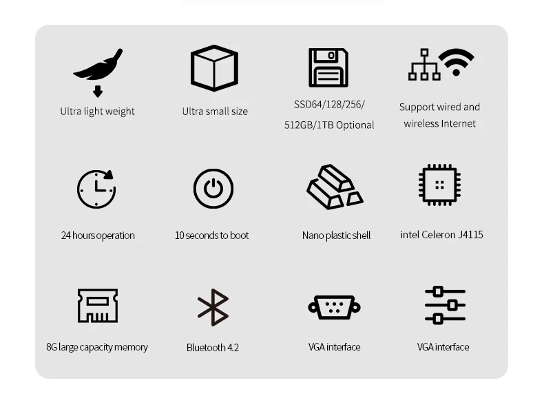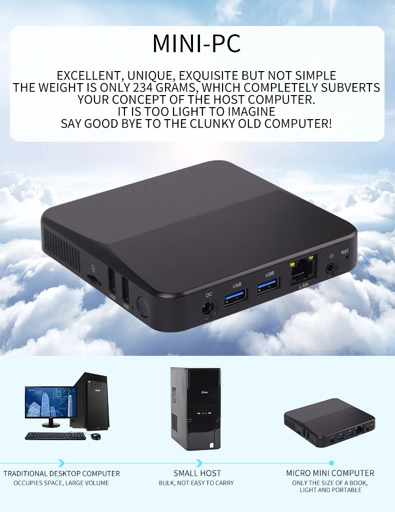 Specification: Small Dimension P3T Mini PC Win10 Linux Celeron J4115 8G 64G SSD 64G/128G/256G/512G/1T USB3.0 BT4.2 WIFI VGA RJ45 Mini Laptop