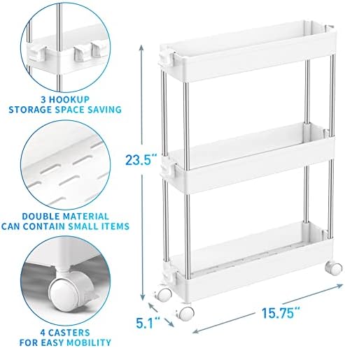 SPACEKEEPER 3 Tier Slim Storage Cart Cell Shelving Unit Organizer Slide Out Storage Rolling Utility Cart Tower Rack for Kitchen Toilet Laundry Slender Locations, Plastic & Stainless Metal, White