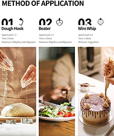 【Tilt Head & Auto Energy off Design】Handy to intall/unistall 3 mixing attachments: dough hook, whisk, and beater. Auto energy off make sure the safty whereas utilizing.