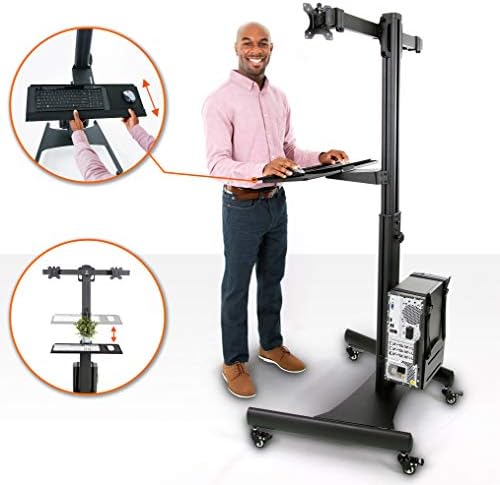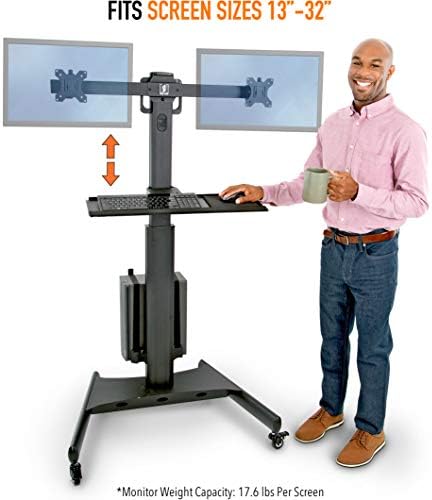 Stand Regular Twin Monitor Cell Workstation with Keyboard Tray, CPU Holder and Locking Wheels | Peak Adjustable VESA Mounts for Two Screens | Helps Screens from 13 to 32 Inches (Black)