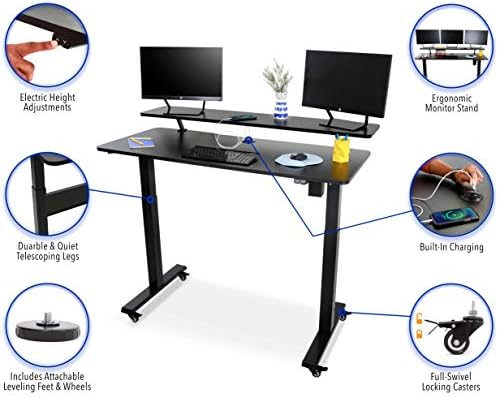Stand Regular Tranzendesk Energy | 55 Inch Electrical Standing Desk with Constructed-In Charging | Peak Adjustable Stand Up Desk with Clamp On Shelf | Digital Desk with 1 AC Outlet & 2 USB Ports (55/Black)