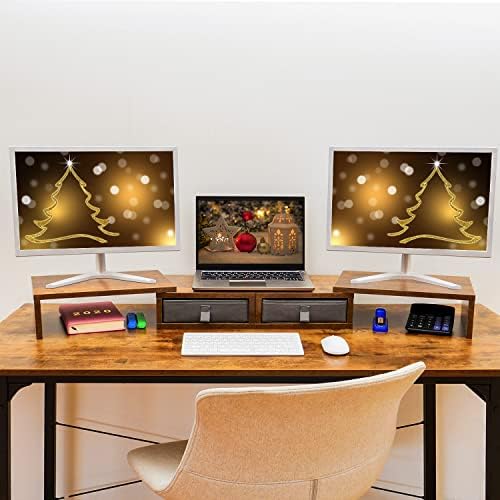 TEAMIX Twin Monitor Stand Riser with 2 Drawers – Size and Angle Adjustable 3 Shelf Monitor Riser with Storage Desk Organizer Giant Monitor Stand for two Displays/Laptop computer/PC,Display/TV Stand Riser