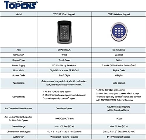 【Extensive Compatibility】 Works with all TOPENS gate openers, and suitable with most third social gathering swing or sliding gate opener whose management board accepts “Usually Open Dry Contact” sign. It may be powered by the management panel of the entry management system or by the exterior DC 12V-24V energy supply. In contrast with a wi-fi keypad, TC175P is an ideal resolution in places the place frequency interference is occurred or the place the management field is put in far-off from the gate operator.