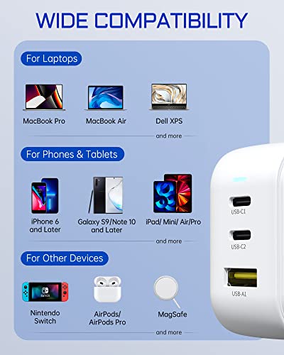 USB C Charger, Aergiatech 65W PD3.0 GaN PPS QC3.0 Kind C Quick Charging Energy Adapter Foldable 3Port Charger Block for iPhone, for MacBook Professional, for iPad Professional, Swap, Galaxy S22/ S21/S20 White