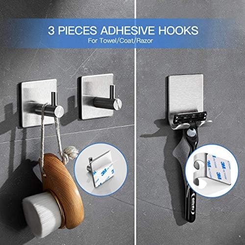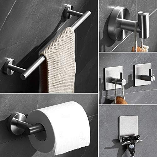 [COMPLETE 6-PIECE SET]: 6 piece toilet {hardware}: 16 inch towel bar, rest room paper holder, 3 items of self-adhesive towel hooks and 1 shaver/toothbrush holder. An entire set to arrange all of your toilet facilities