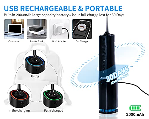 【4 Mode & Lengthy Battery Lifetime】Regular, Gentle, Pulse and DIY mode. You possibly can select probably the most comfy mode. Gentle mode is really useful for the primary time utilizing. Our rechargeable flosser with newest 2000mAh Lithium battery is ready for use constantly for 25-30 days as soon as 4 hours charged.