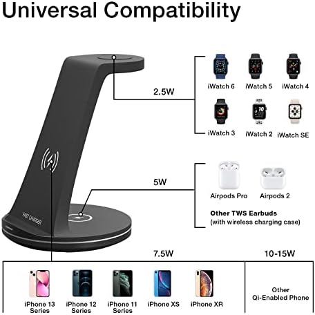 [Universal Compatibility] The wi-fi charger can cost 3 units on the identical time. iPhone dock suitable with iPhone 13/12 Mini/Professional/Professional Max, 11/ Professional/Professional Max, Xs, Xs Max, XR, X, 8/ Plus, Apple iWatch SE/6/5/4/3/2, AirPods 2/ Professional, and different 100+standard Qi-Enabled telephones and earbuds with wi-fi charging case. Please use the QC3.0 adapter to cost 3 units on the identical time ▶Adapter is included. Not for Apple Watch 7 Sequence◀