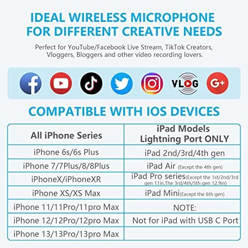 【Solely Appropriate with iPhone/iPad】The Bicboz wi-fi lapel mic for iphone can work with iPhone 6/ 6 Plus, 7/ 7 Plus, 8/8 Plus, iPhone X/XR/XS/XS Max, 11/11 Professional/11 Professional Max, 12/12 Professional/12 Professional Max, 13/13 Professional/13 Professional Max, iPad 2nd/third/4th gen, iPad Air sequence(Besides the 4th gen), iPad Mini(Besides the sixth gen), iPad Professional sequence (Besides the first/2nd/third gen 11in. The third/4th/fifth gen 12.9in) 【Not assist these iPads with type-c port】